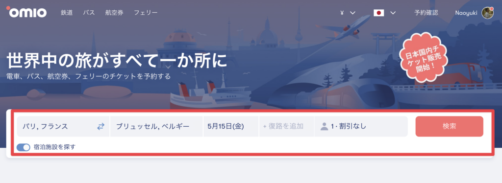 Omioの予約方法は、出発地・目的地・日程・人数を入力して検索をクリックするだけです。