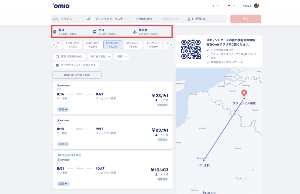Omioの料金は出発地から目的地、そして日程、人数によって変わってきます。